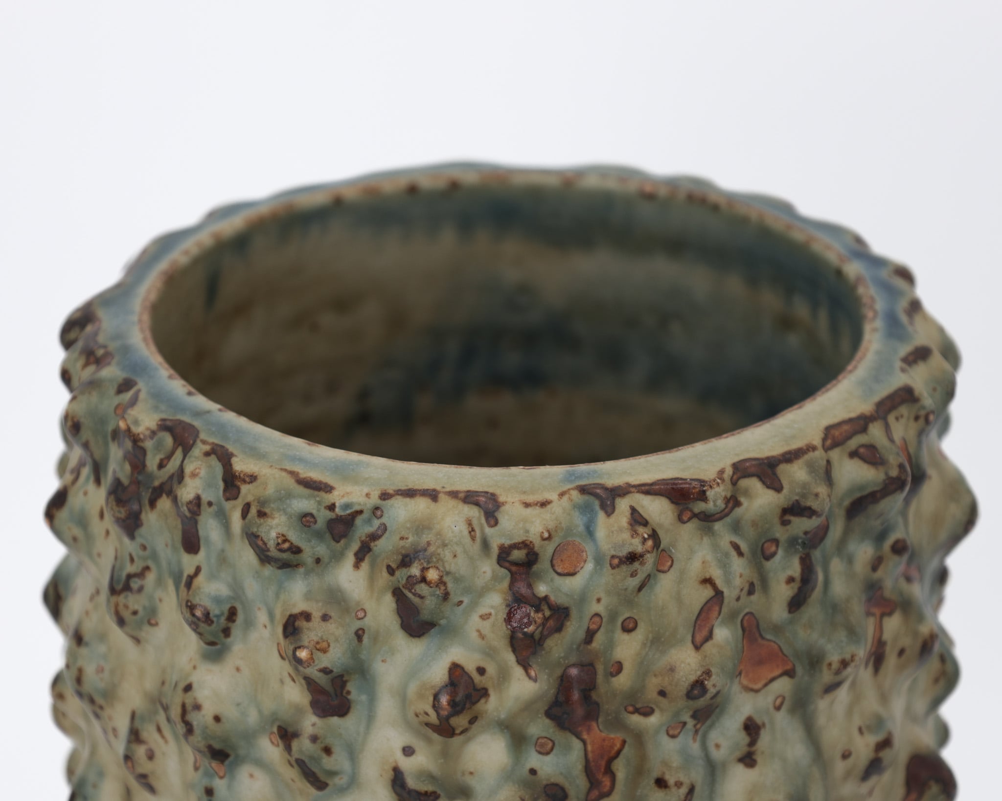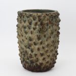 Axel Salto indtager en central position i dansk keramikhistorie og er kendt for sit organiske formsprog, udviklet med afsæt i naturens vækstformer. Vasen er udført i den knoppede stil, hvor overfladen er modelleret med markante, organiske udvækster, som giver formen et tydeligt skulpturelt udtryk, karakteristisk for Saltos praksis. Den kraftige sung-glasur i grønne og brunlige nuancer understreger formens rytme og dybde og fremhæver værkets taktile karakter.