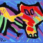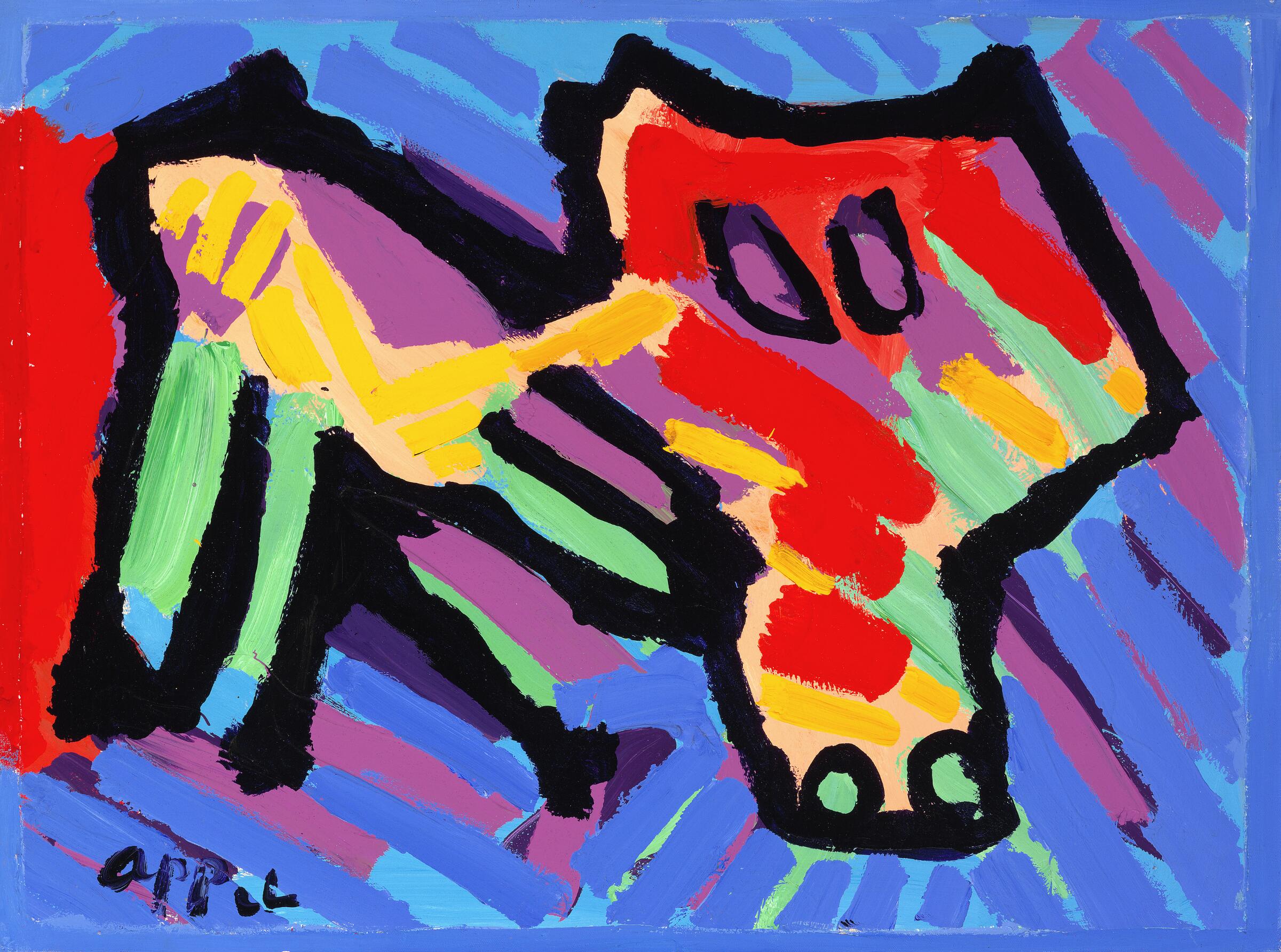 Den foreliggende figurkomposition er opbygget omkring en dyrelignende skikkelse, afgrænset af sorte konturer og udfyldt med tætte farvefelter. Baggrunden er behandlet med diagonale penselstrøg, der aktiverer billedfladen og skaber en fornemmelse af bevægelse. Værket viser Appels karakteristiske sammensmeltning af figuration og malerisk frihed med referencer til et barnligt formsprog, hvilket er typisk for hans praksis.