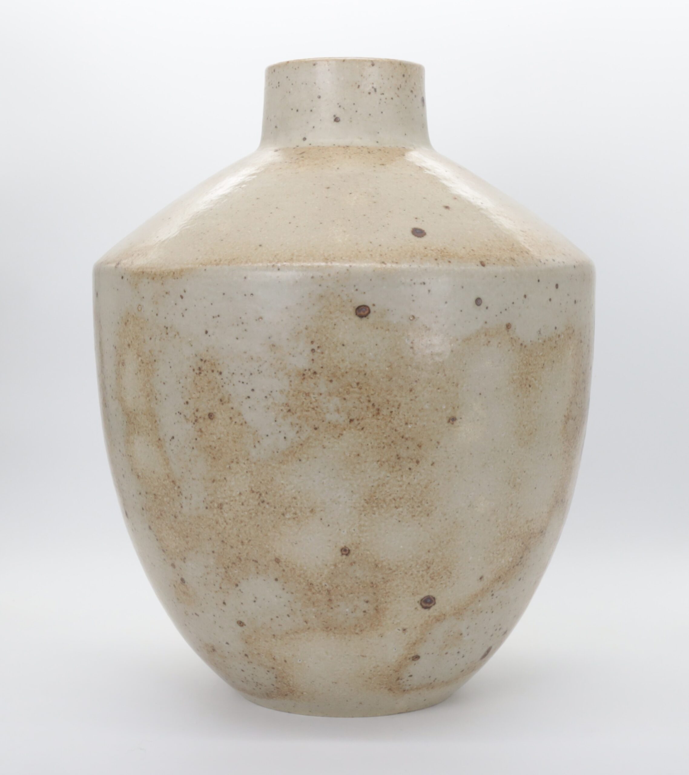 Stor unika vase af stentøj dekoreret i brunt, blåt og hvidt.